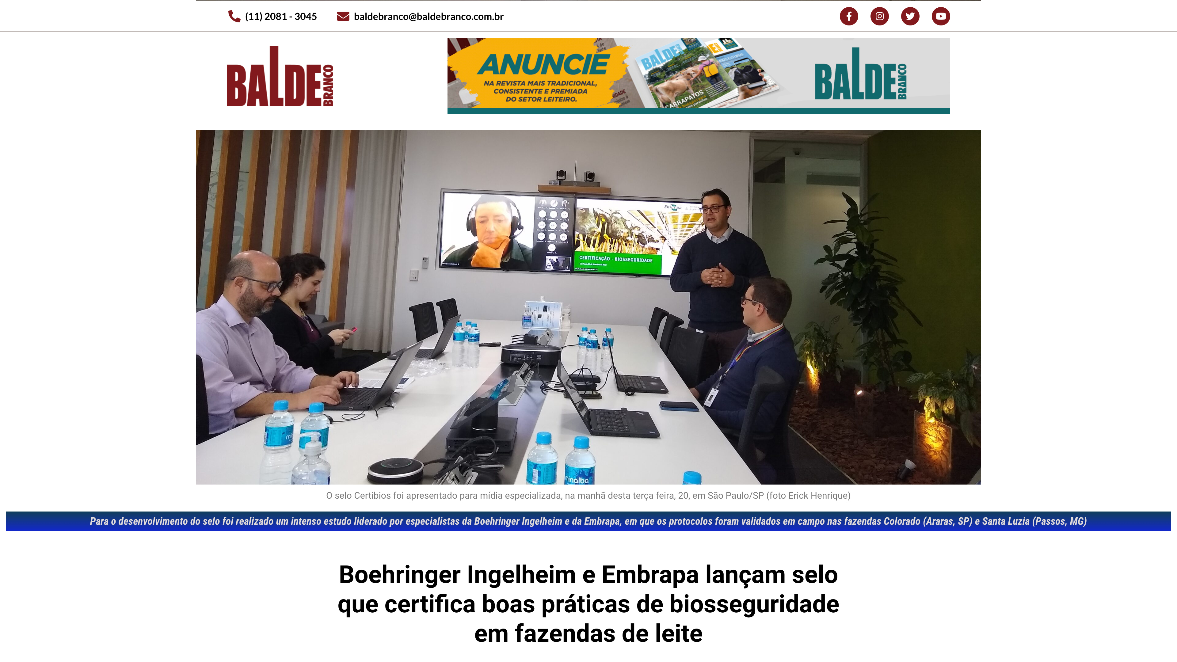 Com o apoio da EMBRAPA, a Boeringer Ingelheim Saúde Animal e o portal Milkpoint promoveram uma live para a apresentação dos resultados da Certificação de Biosseguridade na produção de leite da Fazenda Colorado e da Fazenda Santa Luzia. A certificação confirma o compromisso do produtor com a qualidade do leite, o bem-estar animal e as exigências do consumidor atual.